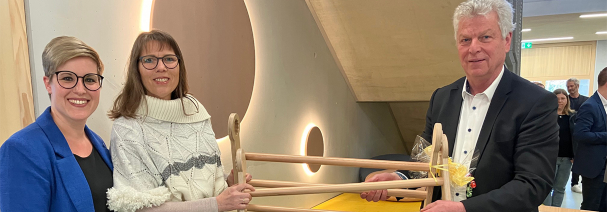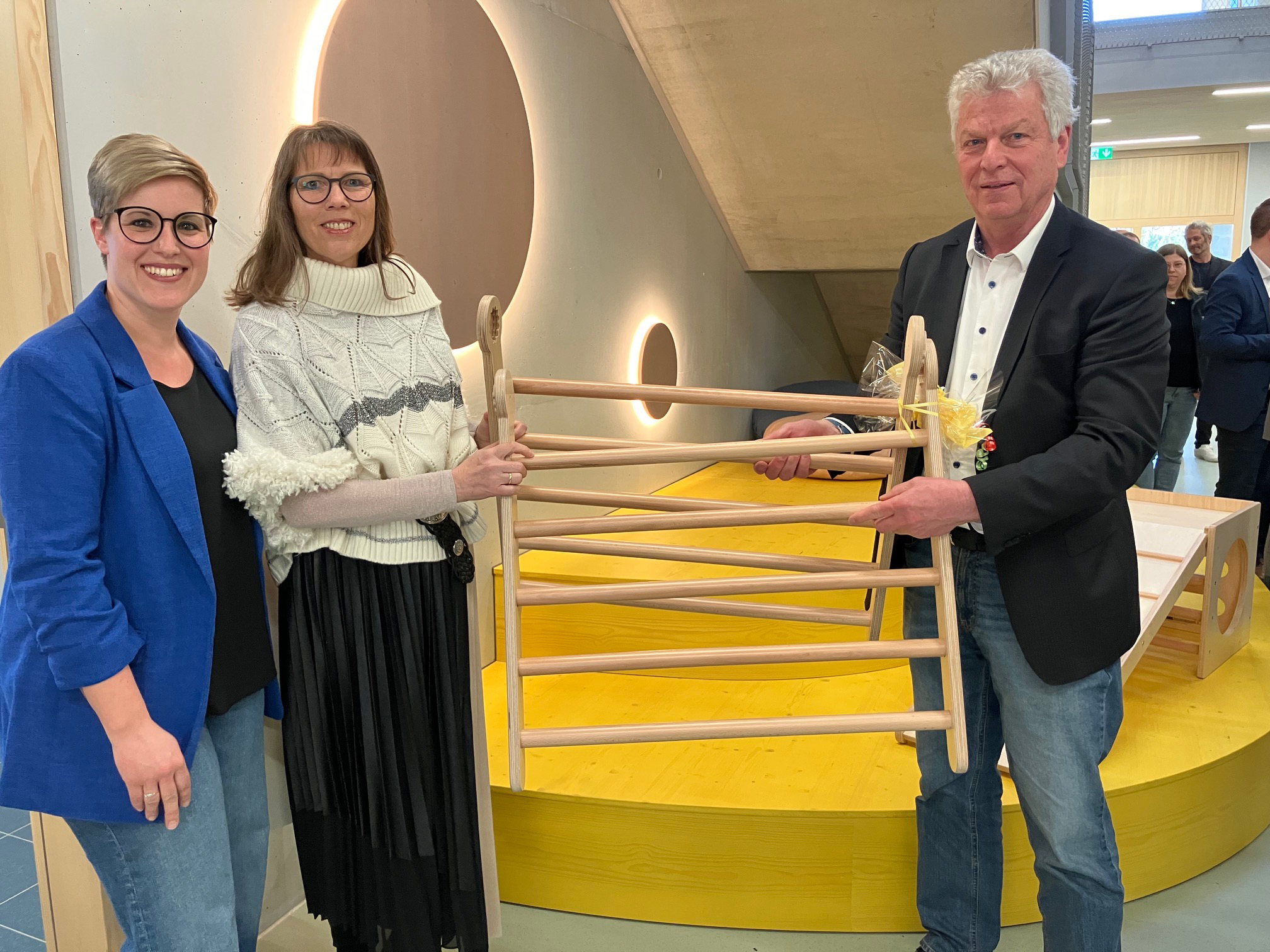 Im Rahmen der Einweihung übergaben wir dem Oberbürgermeister Herrn Kessing und der stv. Kindergartenleitung, Frau Jennifer Maierhofer, ein nachhaltiges und hochwertiges Spielgerät: Kletter-Set Kari nach der Bewegungspädagogik von Emmi Pikler, denn Klettern macht selbstbewusst und stark.